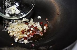 锅烧热,放入一大勺香麻油,将花椒粒及去蒂去籽剪圆圈状的干红椒放入,呛锅煸香后捞出,花椒油倒入调味碗中,将蒜碎和花椒油拌匀;