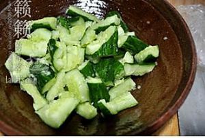用菜刀(或椰锤)将黄瓜拍裂后再切成段状,放入大碗中备用;