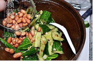 上桌前,将1小碗香脆花生米倒入拌匀装盘上桌。(花生米制作方法详见:详图解:3分半钟微波一盘香脆无比的省油版花生米!)
