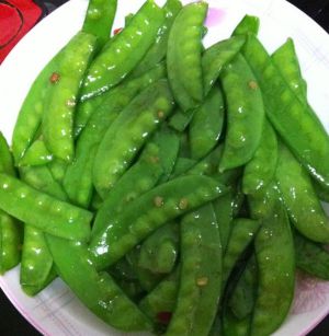油加热,倒入荷兰豆快炒。变色后放盐放加一点点水快炒变深绿色时加味精出锅