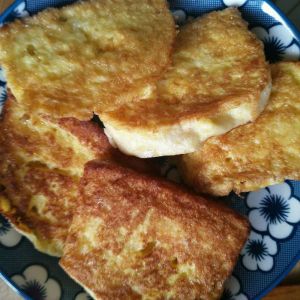 平底锅锅内放适量油,馒头片两面裹好鸡蛋液,放入锅内,小火炸至金黄。