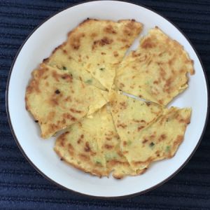 平底锅小火加热,倒少量油,把刚刚做的糊倒进锅里,用铲子摊开,小火慢慢煎,大火会糊,控制火候,翻面再继续煎。