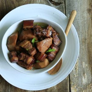 锅底少许植物油,小火慢炒冰糖,直至冰糖融化在油里,然后冰糖变成褐色,这一步挺重要的,如果冰糖炒过头了,口感发苦,如果火候不够,肉下锅冰糖结块。炒的刚好的糖色应该是肉下锅,糖色像淡酱油的颜色一样包裹在肉上面。