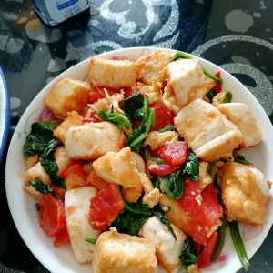 放适量油,放入鸡蛋,成型后,放入西红柿和菠菜翻炒,放半勺盐
