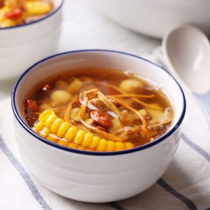 将腌制好的排骨、泡软的芡实、玉米、已经清洗干净的莲子、虫草花、干贝、枸杞统统倒入九阳桃花盏隔水炖锅的大炖盅里;