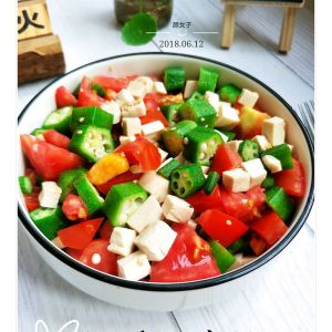 秋葵煮熟泡在凉白开水里面防止氧化。豆腐烫一下开水