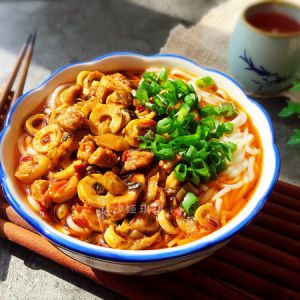 放上美味的竹笋酸菜牛肉臊子和葱花!