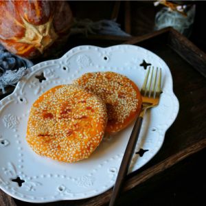 粘上一层芝麻后,再按成饼,胚子就做好了。