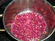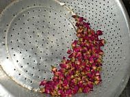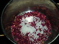 将花瓣、红糖、盐放入一个碗状器皿内(避免用金属器皿),放置方法是先放一层玫瑰花瓣,然后放一层红糖、盐,再放一层花瓣,然后再放一层红糖、盐。依次而行,直至用完原料