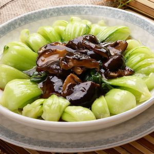 用泡过香菇的水加一点淀粉勾芡,关火。淋上排好盘的油菜上。