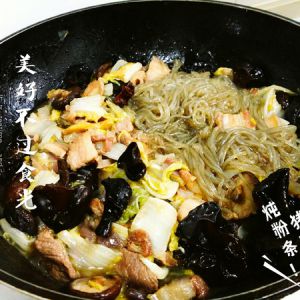 最后放入香菇、黑木耳和粉条,转大火,翻炒至粉条透明变软熟了即可!另外可加少许鸡粉提鲜。