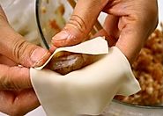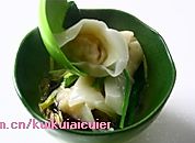 取一张馄饨皮,中间包入一点馅料,加入一个虾仁块,然后如图包成馄饨形状。