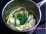 锅中放入新的水,煮沸后下入包好的馄饨,锅再次煮沸后改小火再煮两分钟左右,下入菠菜和鸡蛋丝,关火。
