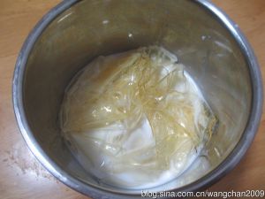 牛奶隔热水加热,加入提前用冰水泡软的吉利丁片拌至融化.