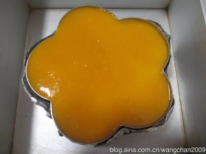 将芒果果冻层淋在蛋糕上冷藏凝固。脱模即可