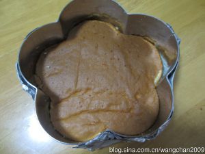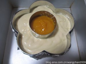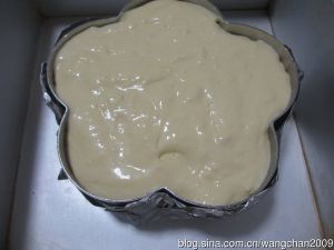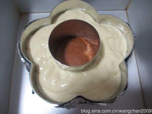 模具中间放一个小号的圆形慕斯圈,周围先倒一层芝士糊,