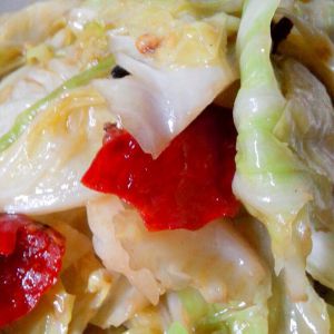 下猪油/化油,依次加入干花椒,蒜瓣,干辣椒丝,爆香后加入洗好沥干水分的包菜翻炒一会。