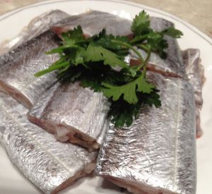 刀鱼洗净去内脏,切成大8厘米左右的块,加少许盐和料酒腌制。