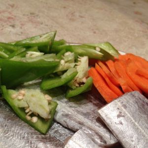 辣椒切块,胡萝卜切片,葱,姜蒜切末备用。