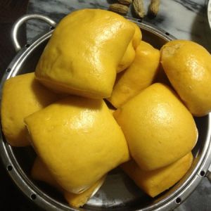 将南瓜泥、糖、面粉和酵母粉依次放入面包机,用和面模式