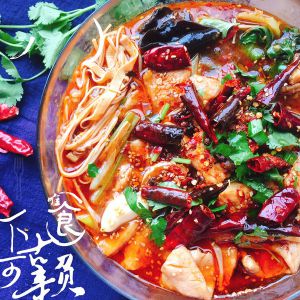 锅中放入30g植物油,放入干辣椒,花椒,爆香后捞出,用剩下的油炒较易熟的蔬菜(白菜,豆芽)。