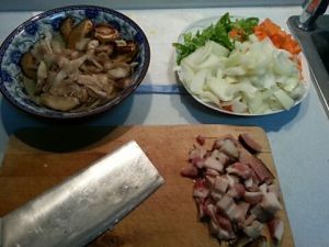 各种切丁,蘑菇洗净后泡水,水不要倒,一会有用!