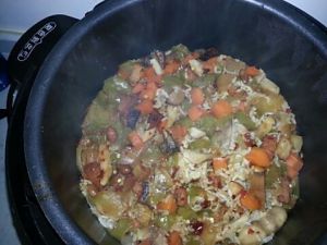导入刚才的炒料,和生米搅拌均匀,加入泡蘑菇的水,比正常煮饭的水略少,指关节一个不到,估计大家都有自己的诀窍!