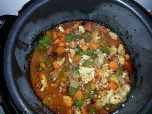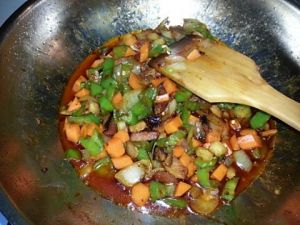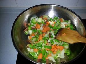 热锅热油,下肉煸熟,加入青椒、胡萝卜、洋葱翻抄
