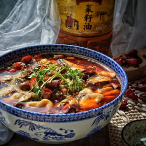 花椒炸到脆,捞出。下郫县豆瓣酱,小火慢慢炒出红油