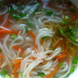 骨汤入锅大火烧开,入面条,开锅后下入胡萝卜丝,烧开转小火,熬10分钟左右关火。蒜苗段入碗,虾皮捞出放入碗里,面条和骨汤一起倒入碗里,点上香油及生抽即可