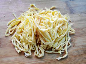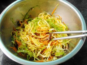 油锅中把胡萝卜丝和香菇丝炒一下;(不炒直接拌也可以)