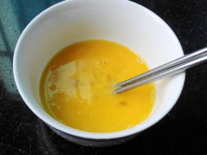 鸡蛋打散在碗里,加适量盐和料酒搅拌均匀;