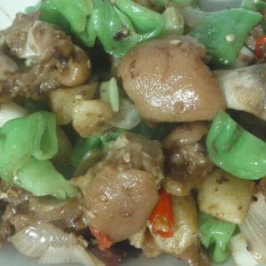 锅内放入姜蒜和干花椒爆香,此步骤可添加些八角桂皮,把卤猪蹄放入锅中翻炒,加点料酒和生抽,如卤猪蹄本身咸了,就不要加生抽,把土豆和洋葱、鲜花椒、小米椒放入锅中,放少量热水,开锅后加青椒、大葱盖锅盖稍闷,然后翻炒至水干起锅,喜味精的可在起锅时加。
