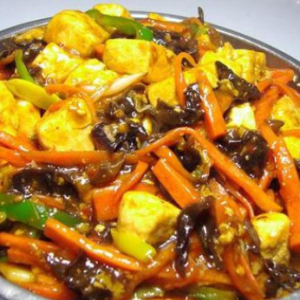 豆腐从盐水中捞出沥干水分,热锅凉油,放入蒜末爆香,放胡萝卜木耳翻炒,听到木耳爆出响声,放豆腐翻炒,至金黄色,放调好的汁小火咕嘟一下,放一勺盐,待汤汁浓稠后关火,出锅装盘撒上小香葱即可