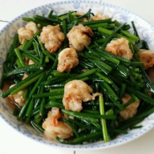 刷锅,锅内放油,油热后放入葱花,葱香味出后,将韭苔倒入锅内,旺火快炒,放入盐一勺,加入少许高汤,放入生抽约五分钟,倒入虾球搅匀,再炒至两三分钟,出锅