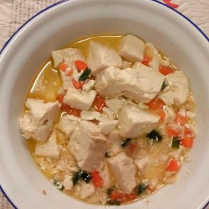 准备葱花,胡萝卜切丁。豆腐切块,热水焯一下。