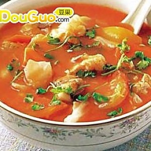 圆白菜洗净,切小块,放入排骨中同煮,最后放入切块的番茄及番茄酱、盐调味。
