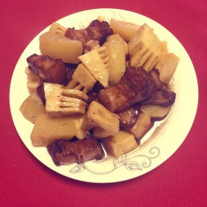 在压肉这25分钟内,将土豆刮好皮切成块,将春笋也切成块,做好准备