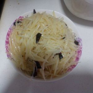 把土豆丝放在盆里先洗一遍,在把土豆丝放在水里净个五分钟(这样土豆丝会脆一点)。