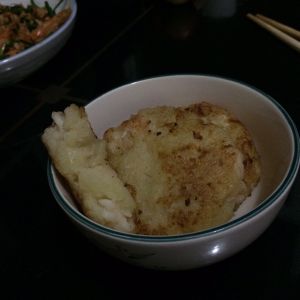 平锅倒油,热锅凉油,小火煎土豆饼,时间不用太久,很容易熟,太久会影响口感和色泽。装盘,美味即刻呈现。可蘸自己喜欢的酱料,如番茄酱,不过,鱼儿认为,原味最棒。