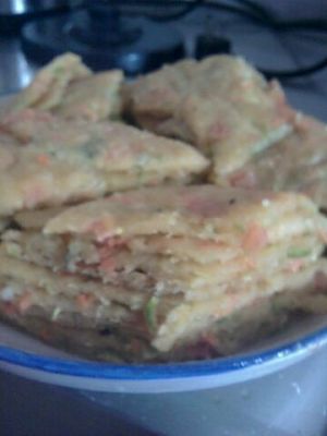 把材料放到盆里,打入鸡蛋,搅匀。取适量面粉加入适量盐搅匀(我们在外租房没有平底锅,所以用炒锅代替,怕粘锅所以我没弄面糊)