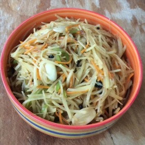 先将土豆、尖椒、胡萝卜、各切成丝、