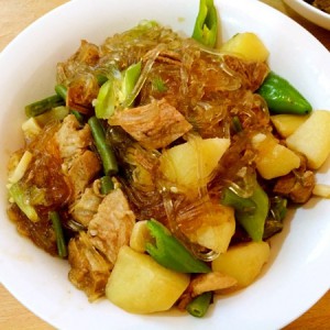 将切好的猪肉和土豆放入锅中翻炒,两分钟后把先前的肉汤倒入锅中,并放入适量的粉条,小火慢炖5分钟开锅食用。