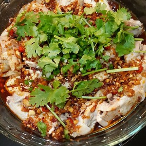 将冰水中的鸡捞出 切块装盘 撒上花生沫 将调料 辣椒油混合 淋在鸡块上 撒上葱花 香菜 出菜!