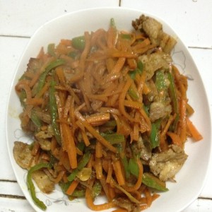 锅里加油 倒入胡萝卜和青椒翻炒两分钟倒入炒好的肉丝 加盐和鸡精 就可以了