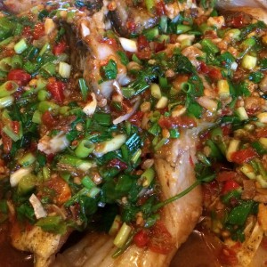 将鱼放入炒好的料里加水煮几分钟,捞起鱼,放入葱,藿香,香菜,加入鸡精,花椒油,淋在鱼上既可。