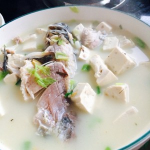 把开水倒进鱼锅里,倒入豆腐,放入盐巴,放料酒,保持大火煮开滚一滚,调小火煮半个小时,放点鸡精调味,放入葱花出锅
