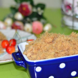 将擀碎了的肉丝放入面包机桶,然后选择【21肉松】,然后轻轻的摁一下启动键,就静静的等待酥软的肉松出炉吧。