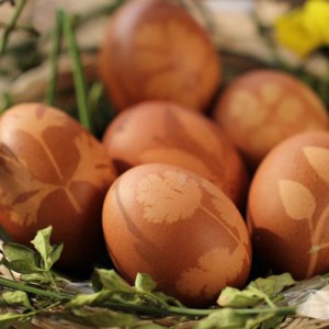 用打湿的纱布将贴有绿叶的鸡蛋包裹住;