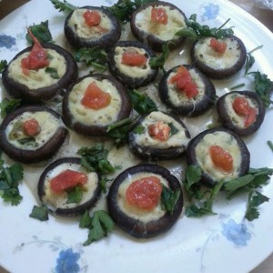 将放料后的鸡蛋再打一下,用小勺盛着蛋液一个个填入香菇内。